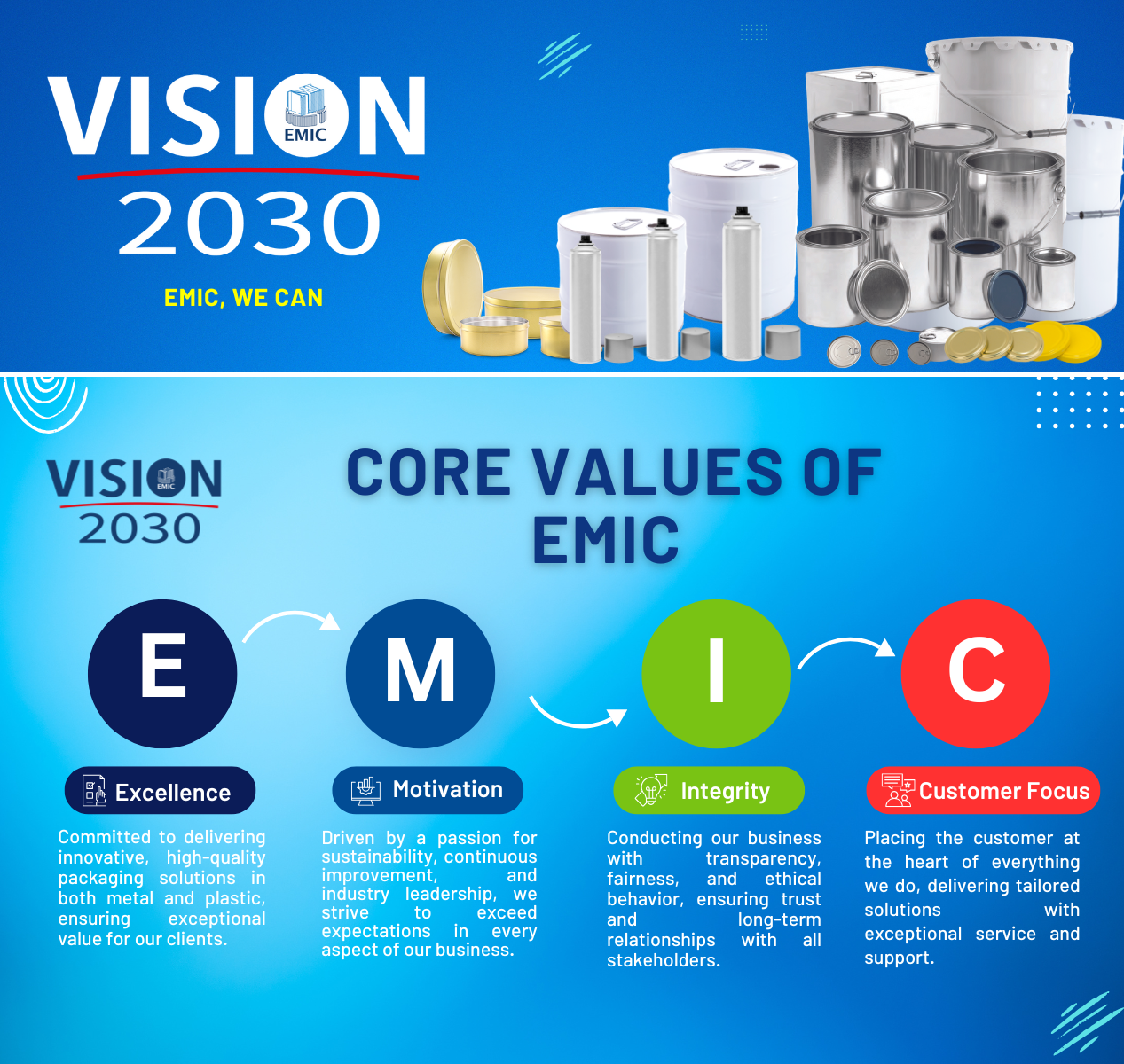 Our vision is to lead the regional packaging industry with innovative and sustainable solutions in metal and plastic packaging. We aim to expand our portfolio for industrial and food-grade sectors, meeting evolving customer needs with high-quality, reliable, and efficient offerings. By embracing sustainability, energy-saving practices, and Industry 4.0, we drive smart manufacturing and deliver exceptional value to customers and stakeholders alike.